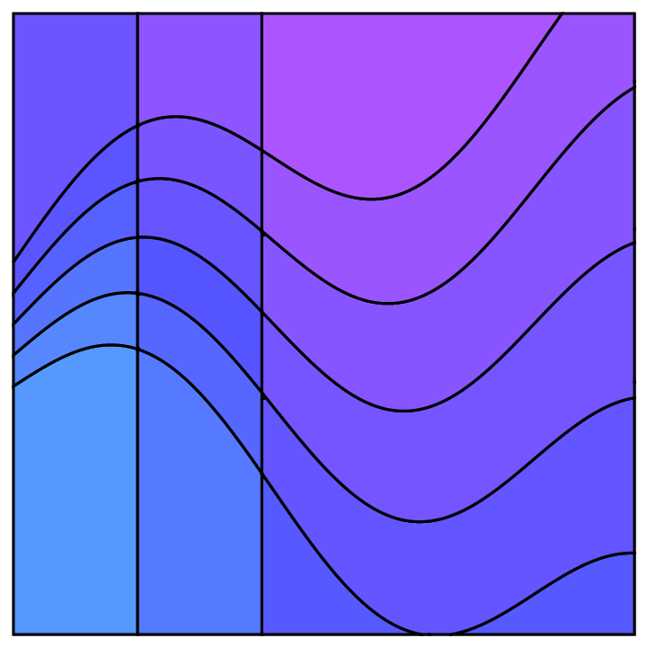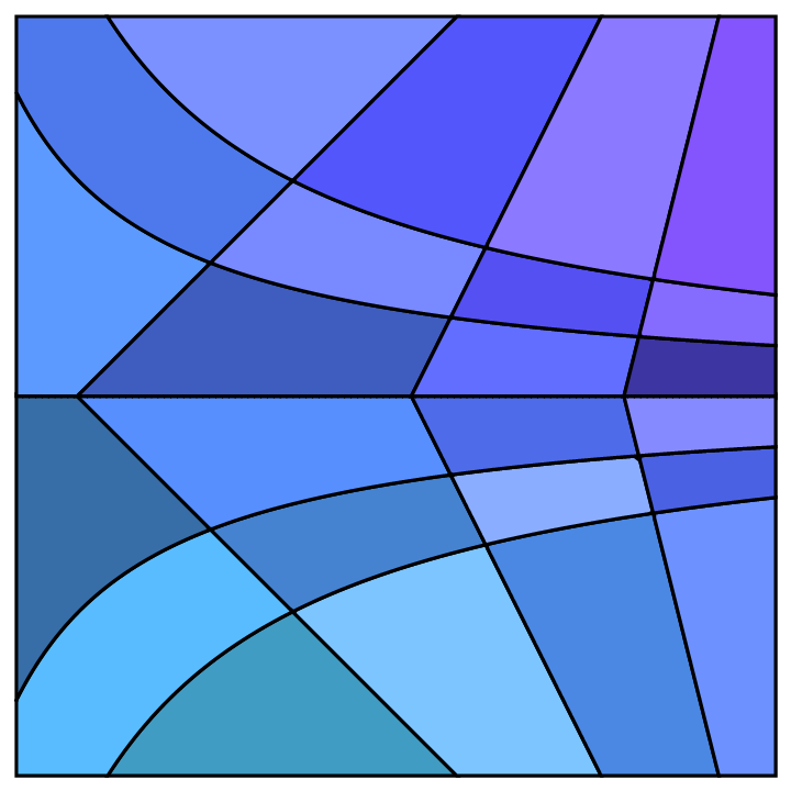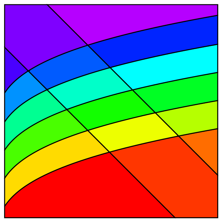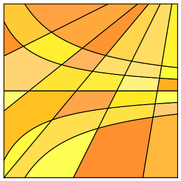Two families of mathematical functions curve through space; the regions that they generate are colored algorithmically.